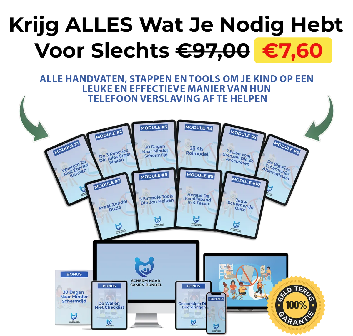 Je kunt vandaag de VOLLEDIGE Scherm Naar Samen Bundel krijgen, die ervoor zorgt dat je eindelijk alle tools en strategieën hebt om je kind van hun schermverslaving af te helpen, zonder ruzies en met een sterke focus op samenwerking en begrip.