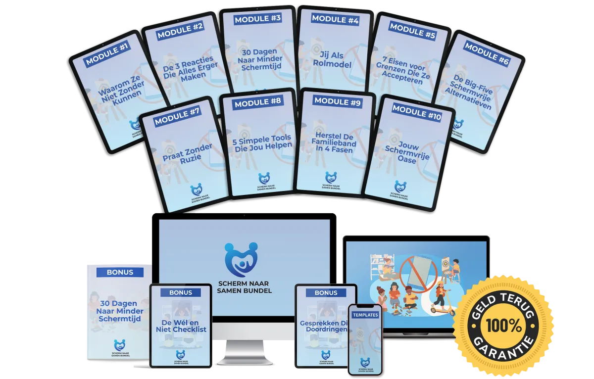 Hoe? Je krijgt een volledig pakket aan strategieën, inzichten en tools die je stap-voor-stap helpen om schermtijd te verminderen, vertrouwen te herstellen en samen meer tijd als gezin door te brengen.